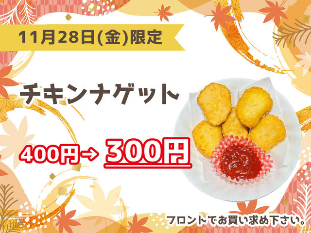 [アツアツ]チキンナゲット 通常400円を300円でお召し上がりいただけます。