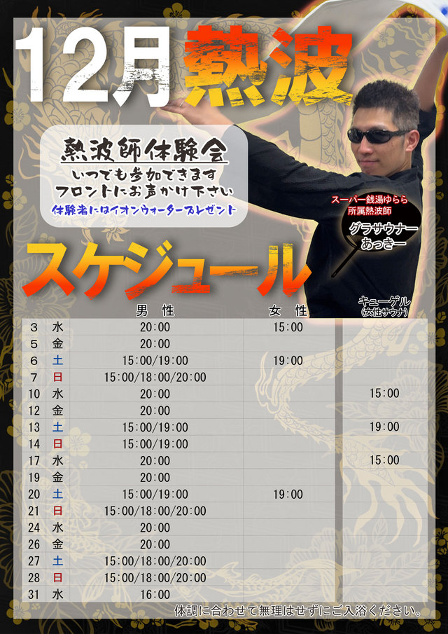 12月のサウナイベントスケジュールです。 体調に合わせて無理はせずお楽しみください。 また当館では随時、熱波師の体験会を行っております。 必要な用具などはお貸しいたしますので興味がある方はお声かけください。 体験いただいた方にはイオンウォータープレゼント。