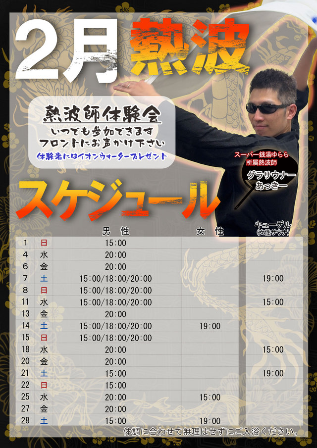 2月のサウナイベントスケジュールです。 体調に合わせて無理はせずお楽しみください。 また当館では随時、熱波師の体験会を行っております。 必要な用具などはお貸しいたしますので興味がある方はお声かけください。 体験いただいた方にはイオンウォータープレゼント。