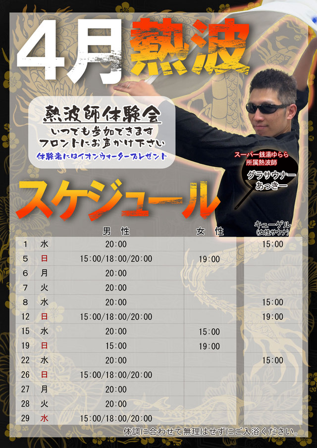 4月のサウナイベントスケジュールです。 体調に合わせて無理はせずお楽しみください。 また当館では随時、熱波師の体験会を行っております。 必要な用具などはお貸しいたしますので興味がある方はお声かけください。 体験いただいた方にはイオンウォータープレゼント。